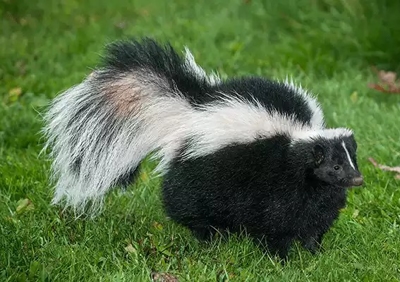 SkunksSetting appearance aside for a moment, skunks are easily identified by the potent smelling liquid that they spray to defend themselves. Skunks grow to be about the size of a typical housecat, the fur on their bodies is black in color and they have a distinctive white strip which starts at their head, then divides into two stripes. The stripes travel down the length of their bodies where they meet fluffy tails.